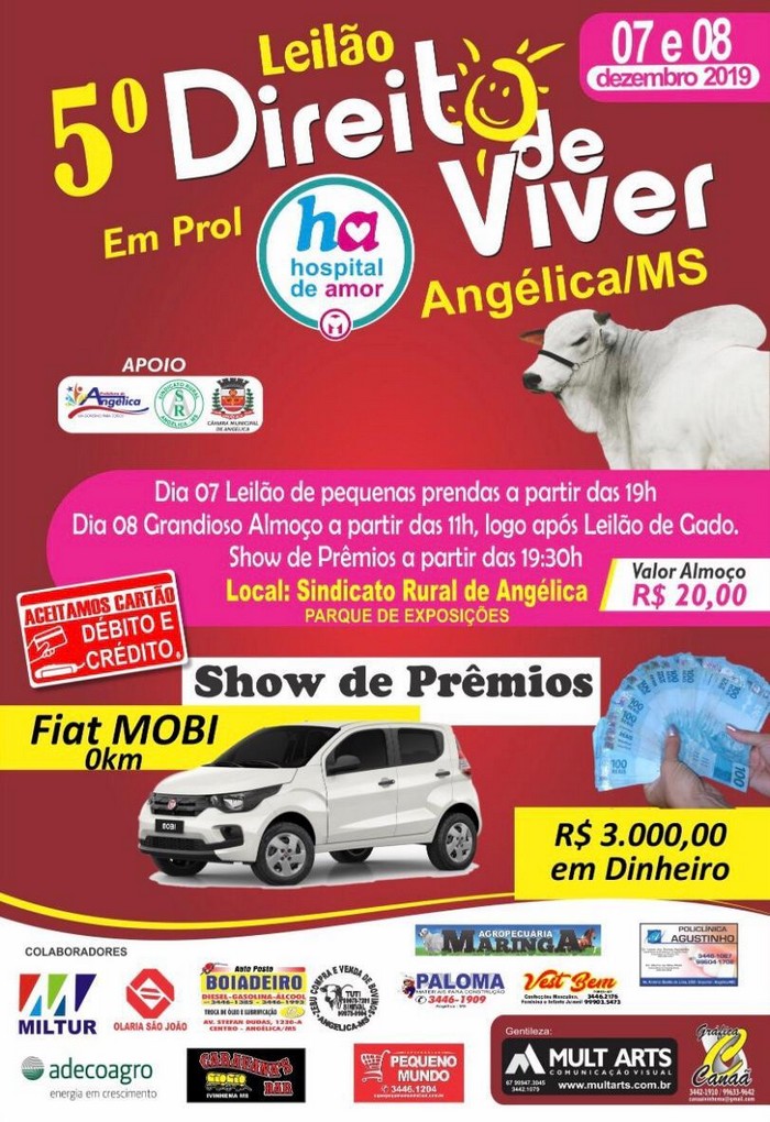 Nos dias 07 e 08 de dezembro, o município de Angélica será palco de mais um evento em prol ao Hospital de Amor. O Leilão Direito de Viver chega em sua 5ª edição e, assim como todos os anos, busca angariar fundos ao Hospital que registra 6.000 atendimentos/dia, 100% gratuitos, além de acolher pacientes de todo o Brasil, com profissionalismo e humanização.