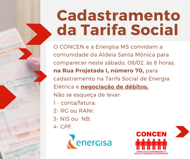 Neste sábado, 08/02, o Conselho dos Consumidores da Área de Concessão da Energisa MS (Concen) e a Energisa, estarão na Aldeia Santa Mônica, em Campo Grande, para ação de cadastramento da Tarifa Social de Energia Elétrica (TSEE). Na ocasião, a concessionária também fará negociação de débitos.