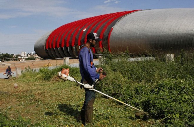 Limpeza da área externa da obra, coordenada por equipe da Agesul que cuida da segurança e conservação do local – Foto: Chico Ribeiro