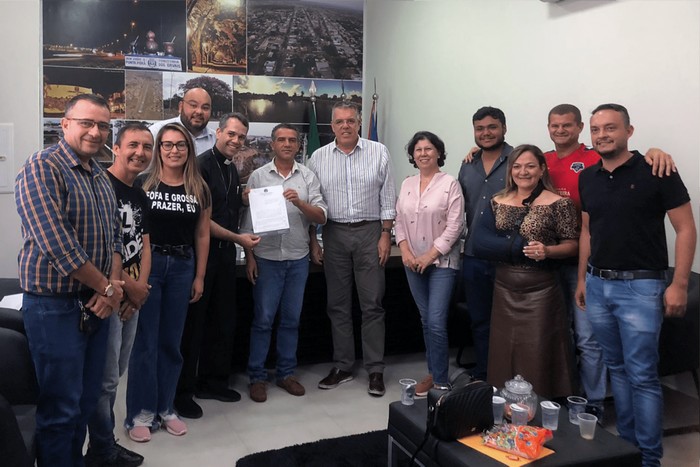 Nesta semana, o padre Acácio Cardoso, da paroquia Nossa Senhora do Perpetuo Socorro, recebeu das mãos do Presidente da Câmara Municipal, Vanderlei Avelino, e das mãos do Vice-prefeito Eduardo campos, um documento comprovando a aprovação do projeto que autoriza a doação.