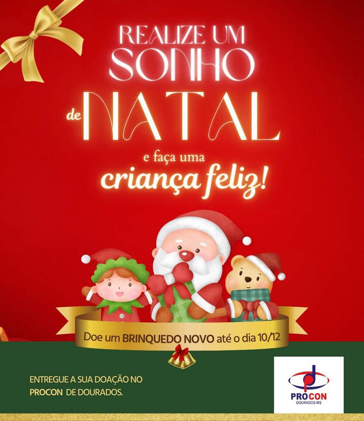 Com o Natal se aproximando, o Procon de Dourados (Programa Municipal de Proteção e Defesa do Consumidor) realiza uma campanha solidária visando tornar a data mais especial para crianças em situação de vulnerabilidade. O órgão arrecada brinquedos até o dia 10 de dezembro e posteriormente vai doar os itens para comunidades periféricas da cidade.