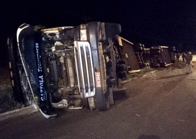 Uma carreta canavieira tombou por volta das 23h desta segunda-feira (21), na MS-156, entre Itaporã e Dourados, na rotatória da Guacira Alimentos.