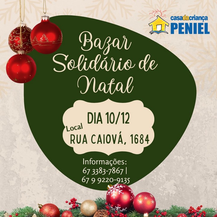 O Bazar Solidário da Casa Peniel será realizado na Rua. Caiová, 1684, Jardim São Lourenço, no sábado, dia 10 de Dezembro, das 09h às 18h.