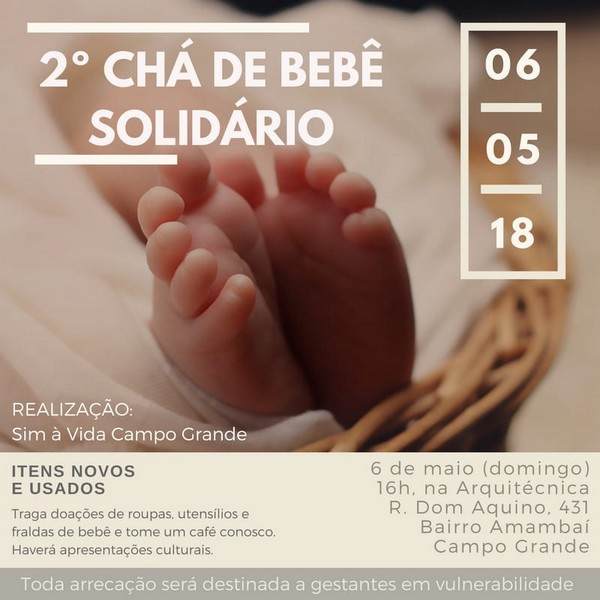 O 2º Chá de Bebê Solidário de Campo Grande é uma iniciativa do grupo Sim à Vida, formado por uma equipe multidisciplinar de apoio às mães em situação de vulnerabilidade e conta com profissionais da área do Direito, Saúde, Psicologia e Comunicação. O Sim à Vida começou a atuar no ano passado e já atendeu dezenas de gestantes que se encontram com alguma dificuldade econômica, emocional, psicológica ou social. Outras informações pelo telefone 99293-0169.