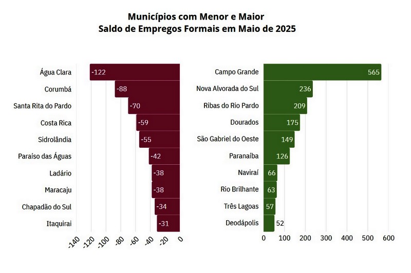 Na distribuição regional, os municípios com maiores saldos positivos de empregos formais foram Campo Grande (565), Nova Alvorada do Sul (236), Ribas do Rio Pardo (209), Dourados (175) e São Gabriel do Oeste (149).