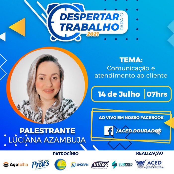 A palestra será ao vivo, iniciando às 7h na página do Facebook da ACED (fb.com/aced.dourados). Para fazer a inscrição, que é gratuita, é necessário entrar no link (https://forms.gle/tmbNRzuPUmddntT39). Os colaboradores das empresas associadas à Aced com maior índice de frequência nas palestras realizadas ao longo do ano concorrem ao Prêmio Assiduidade. Já as empresas que mais incentivam os trabalhadores a comparecer, são contempladas com o Prêmio Aced.