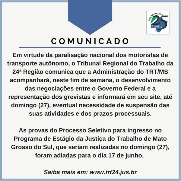 Em virtude da paralisação nacional dos motoristas de transporte autônomo, o Tribunal Regional do Trabalho da 24ª Região comunica que a Administração do TRT/MS acompanhará, neste fim de semana, o desenvolvimento das negociações entre o Governo Federal e a representação dos grevistas e informará em seu site, até domingo (27), eventual necessidade de suspensão das suas atividades e dos prazos processuais.