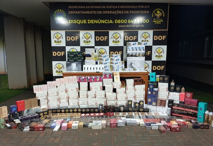 Policiais militares do Departamento de Operações de Fronteira (DOF) realizaram, na noite desta quarta-feira (8), a apreensão de um veículo VW Parati carregado com diversos produtos contrabandeados. Entre os itens estavam 50 pacotes de cigarros, um console Xbox, aspirador de pó, relógios de pulso, receptores de TV, colchões infláveis, caixas de perfumes de diversas marcas e outros produtos de beleza.