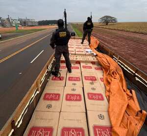 Durante acompanhamento, o automóvel foi abandonado próximo a uma área de mata. Diligências foram feitas na região, mas nenhum suspeito localizado. Em vistoria no caminhão foram encontrados 27.500 pacotes de cigarros, de origem estrangeira.
