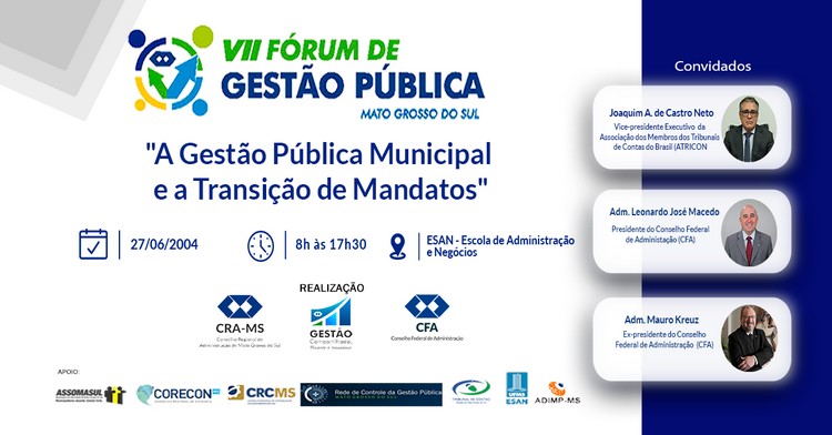 A Comissão de Administração Pública do Conselho Regional de Administração de Mato Grosso do Sul (CRA-MS) realizará no dia 27 de junho, no auditório da Escola de Administração e Negócios da UFMS – ESAN, em Campo Grande, a sétima edição do Fórum de Gestão Pública de Mato Grosso do Sul (FOGESP-MS).