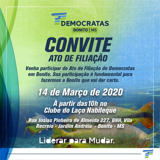 No próximo sábado (14) o diretório municipal do partido Democratas em Bonito promove ato de filiação na cidade. O evento será no Clube do Laço Nabileque com a presença de lideranças estaduais e locais, a partir das 10h. São esperadas 300 pessoas para o encontro.