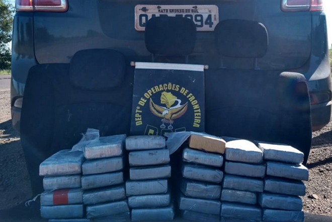 Policiais do Departamento de Operações de Fronteira (DOF) apreenderam, na tarde deste domingo, um veículo Fiat Siena, de cor prata e placas de Campo Grande, carregado com 35 volumes prensados de cocaína, com peso total de 38 quilos. É a maior apreensão do DOF deste tipo de entorpecente em 2019.