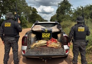 Os policiais do DOF faziam bloqueio na MS-454, zona rural do município, quando abordaram o veículo Oroch, transportando na carroceria dois quartos e uma costela de um semovente.