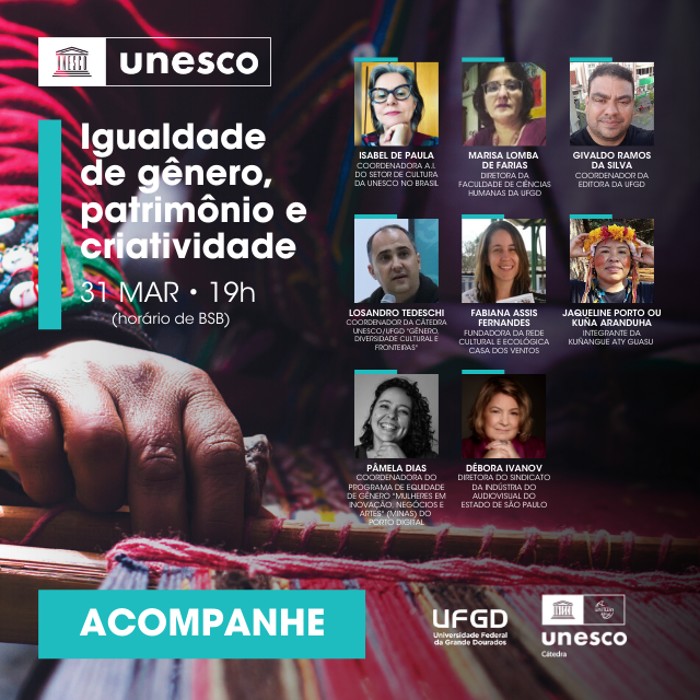 Participarão da abertura do webinar a coordenadora do setor de Cultura da UNESCO no Brasil, Isabel de Paula; a diretora da Faculdade de Ciências Humanas da UFGD, Marisa Lomba de Farias e o coordenador da Editora da UFGD, Givaldo Ramos da Silva. A mediação do evento será feita pelo professor e coordenador da Cátedra UNESCO UFGD, Losandro Tedeschi, e contará, também, com os convidados Fabiana Assis Fernandes, fundadora da Rede Cultural e Ecológica Casa dos Ventos; Jaqueline Porto, ativista e defensora de Direitos Humanos das mulheres; Pâmela Dias, coordenadora do Programa de Equidade de Gênero do Porto Digital, e Débora Ivanov, produtora de cinema e diretora do Sindicato da Indústria do Audiovisual do Estado de São Paulo.
