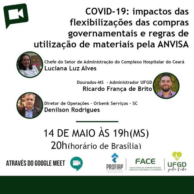 O Mestrado Profissional em Administração Pública (Profiap) da UFGD promove amanhã (14/05), às 20h, horário de Brasília, o segundo encontro on-line do projeto Covid-19: Gerenciando riscos e interrupções na cadeia de suprimento hospitalar, coordenado pela mestranda Angela Maria Azevedo Cardoso Marin, da Faculdade de Administração, Ciências Contábeis e Economia (FACE/UFGD).