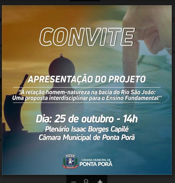O presidente da Câmara Municipal de Ponta Porã, Candinho Gabínio e demais vereadores tem a honra de convidar toda a população para participar da apresentação do Projeto da Escola Estadual Joaquim Murtinho sobre a “Relação Homem-Natureza na Bacia do Rio São João: uma proposta interdisciplinar para o ensino Fundamental”.