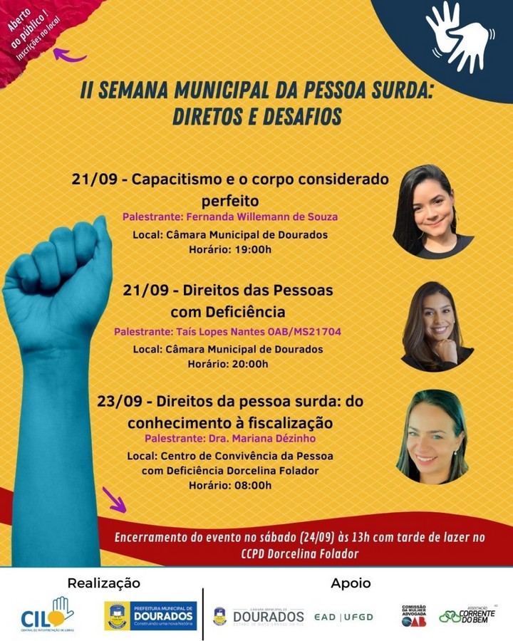 A abertura da Semana da Pessoa Surda acontece nesta quarta, 19h, na Câmara de Dourados. Na programação o assunto abordado será “Capacitismo e o Corpo Considerado Perfeito”, com a palestrante Fernanda Willemann de Souza. Às 20h, o tema é “Direitos das Pessoas com Deficiência”, com a palestrante e advogada Taís Lopes Nantes.