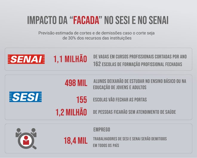O SESI calcula que os cortes levariam ao fechamento de 155 escolas, com perda de quase meio milhão de vagas para jovens no ensino básico e no reforço educacional de adultos com baixa escolaridade. Na prestação de serviços de saúde a trabalhadores, que inclui desde a oferta gratuita de vacinas e exames de mamografia para trabalhadoras, a previsão é de que 1,2 milhão de pessoas ficariam sem o atendimento, tendo de buscar os serviços na rede pública ou custeá-los na rede particular.