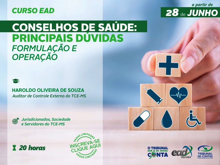 Já está disponível na plataforma Ead da Escola Superior de Controle Externo do Tribunal de Contas de Mato Grosso do Sul, o curso “Conselhos de Saúde: Principais Dúvidas – Formulação e Operação”, ministrado pelo auditor de controle externo e chefe da Divisão de Fiscalização de Saúde da Corte de Contas, Haroldo Oliveira de Souza.