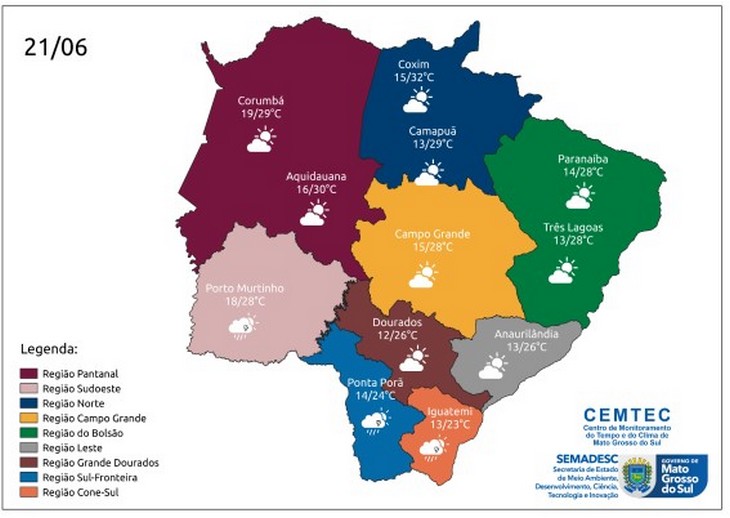 No Pantanal, a mínima em Corumbá será de 19°C e a máxima de 29°C. Na região sudoeste, Porto Murtinho amanhece com 18°C e atinge os 28°C ao longo do dia. No norte, em Coxim, termômetros ficam entre 15°C e 32°C. No Bolsão, Três Lagoas terá 13°C pela manhã e 28°C durante a tarde.