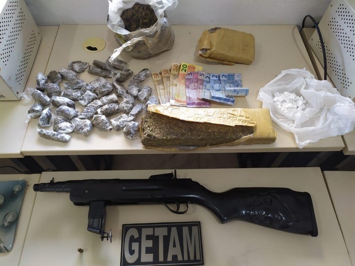 Foi localizado ainda uma espingarda artesanal calibre 9mm, uma munição 7,65 e 86 reais de dinheiro trocado.