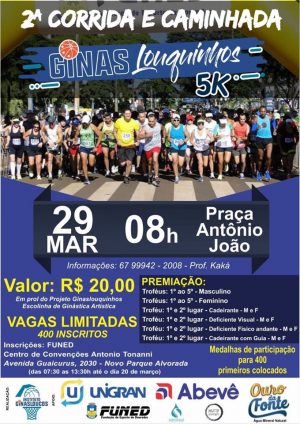 O percurso será de cinco quilômetros, e terá a largada e a chegada acontecendo em frente à praça Antônio João. “Os participantes farão o percurso após a largada pela Marcelino Pires em sentido ao cruzamento com a rua 31 de março e o retorno pelo sentido oposto da mesma avenida até o cruzamento com a Presidente Vargas”, disse “Kaká”, acrescentando que as inscrições estarão sendo feita nas dependências do Departamento de Esportes da FUNED que está situado na avenida Guaicurus, n.º 2030, Novo Parque Alvorada (Centro de Convenções Antonio Tonanni) das 07h30 às 13h30 até o dia 20 de março.
