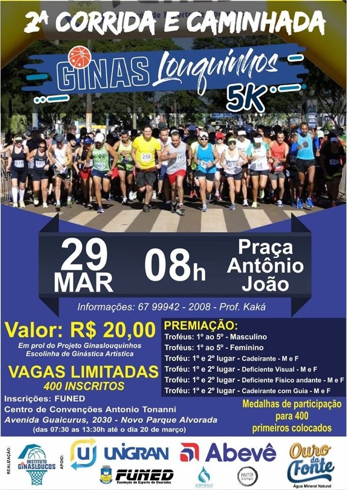 O Instituto Ginasloucos, sob o comando dos profissionais em educação física Rogério Montes e Antonio Carlos Barbosa, o “Kaká”, estará realizando às 08 horas do próximo dia 29 de março, a 2ª Corrida e Caminhada de Rua. A inscrição será 20 reais, e terá a renda revertida para a manutenção do projeto “Ginaslouquinhos, Escolinha de Ginástica Artística”.