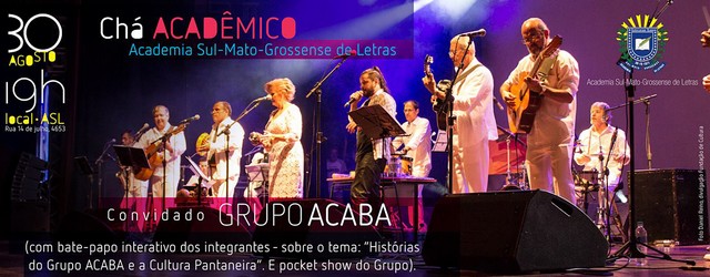 Acontecerá na próxima quinta-feira, 30/08, a partir das 19 horas, o evento da Academia Sul-Mato-Grossense de Letras: ‘Chá Acadêmico da ASL’, que terá como convidado especial o Grupo Acaba. Na programação, que será no auditório da sede atual da ASL: Rua 14 de Julho nº 4653, haverá um papo interativo com integrantes da banda, na abordagem do tema: “Histórias do Grupo Acaba e a Cultura Pantaneira” e um seleto pocket show. A entrada é franca.