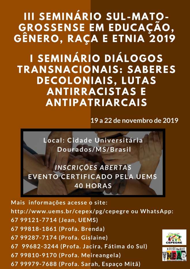 Os interessados em apresentar trabalhos durante o ‘III Seminário Sul-Mato-Grossense em Educação, Gênero, Raça e Etnia’ e o ‘I Seminário Diálogos Transnacionais: Saberes Decoloniais, Lutas Antirracistas e Antipatriarcais’, tem até o dia 15 de novembro para preencher o formulário do evento. Para participar como ouvinte o prazo é dia 17 de novembro.