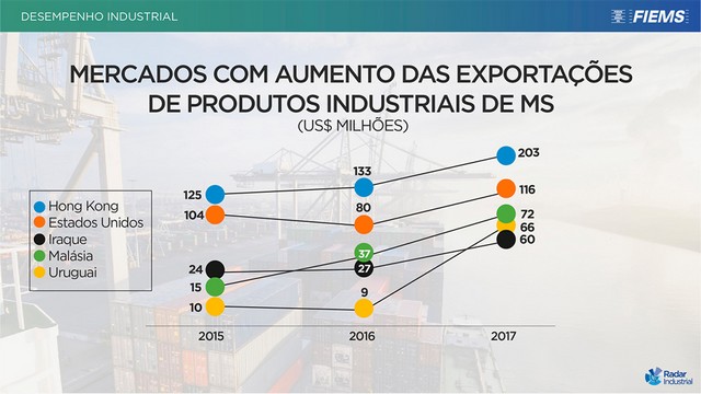 Em dezembro de 2017, a receita com a exportação de produtos industriais alcançou US$ 277,2 milhões, aumento nominal de 16% em relação ao mesmo mês de 2016, quando o valor foi de US$ 238,6 milhões, enquanto no acumulado do ano a receita total alcançou US$ 3,05 bilhões, indicando aumento de 14% em relação a 2016, quando o resultado foi de US$ 2,68 bilhões. Com esse montante, a indústria respondeu por 64% de toda a receita de exportação de Mato Grosso do Sul, conforme destacou o coordenador da Unidade de Economia, Estudos e Pesquisas da Fiems, Ezequiel Resende.