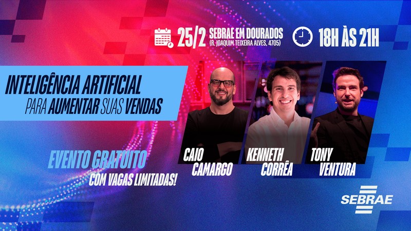 Automação de processos, ganho de eficiência e aumento da competitividade são algumas das vantagens que a inteligência artificial pode trazer para os pequenos negócios. Para ajudar empreendedores a aproveitarem esse potencial, o Sebrae/MS promove, no dia 25 de fevereiro, às 18h, o evento gratuito “Inteligência Artificial para aumentar as suas vendas”, na unidade da instituição, em Dourados. O evento reúne especialistas renomados, como Kenneth Corrêa, Caio Camargo e Tony Ventura, em um talk show para discutir como essa tecnologia pode transformar a estratégia comercial das empresas.