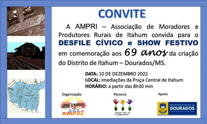 O distrito de Itahum comemora 69 anos de criação neste sábado (10) e para celebrar o aniversário acontece o primeiro Desfile Cívico Militar, que foi idealizado pela coordenadora Laura Vargas, que é organizadora da campanha “Todos por um Itahum Melhor”. “Queremos comemorar o aniversário e trazer cultura e lazer para a comunidade de Itahum”, afirma Laura.