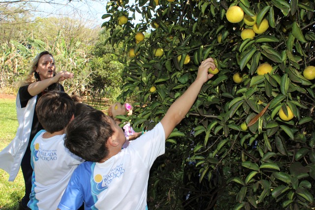 “Trabalhamos em aula os assuntos propostos no material COC, na disciplina de Ciências. Exploramos os diferentes ambientes, observando cada detalhe, nomeando as plantas encontradas, mas resolvi ir além e aliar teoria à prática”, conta a professora. Então, ela aproveitou o rico espaço que a escola oferece – única do município a ocupar uma quadra inteira – para possibilitar aos alunos aprendizado significativo e prazeroso em um momento livre. Eles passearam pelo jardim, conhecendo o aroma das flores; colheram cenoura na horta e, para encerar o tour pela escola, colheram laranja lima diretamente do pé, aproveitando o período da produção.