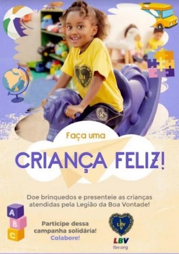 A Legião da Boa Vontade (LBV), mobiliza a comunidade a participar da campanha de arrecadação de brinquedos, novos e em bom estado de conservação, para serem distribuídos às crianças atendidas pela instituição em Campo Grande/MS, por ocasião do Dias das Crianças.