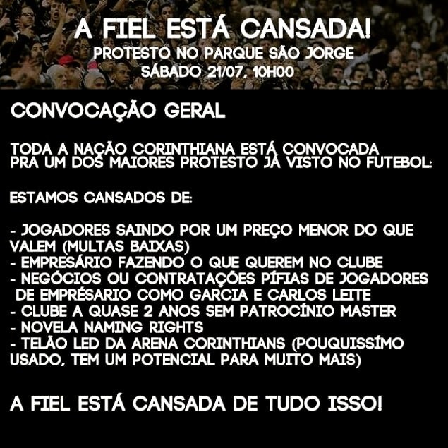 Alguns torcedores do clube preparam um protesto para a manhã do sábado, dia 20, no Parque São Jorge. A informação circulou entre sócios do Alvinegro na noite desta quinta e foi confirmada por alguns corintianos à Gazeta Esportiva, mas a manifestação não será feita pelas torcidas organizadas. A Gaviões da Fiel, por sinal, publicou uma nota de esclarecimento para explicar o motivo de não endossar o protesto.