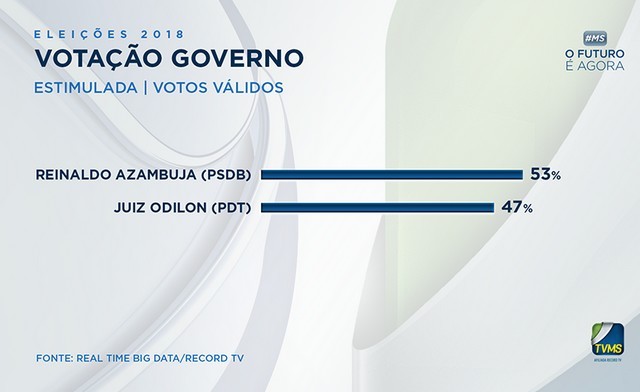 Na reta final da disputa eleitoral o governador Reinaldo Azambuja, candidato à reeleição pelo PSDB aparece com 53% das intenções de votos válidos, seguido por Odilon de Oliveira (PDT) com 47% dos votos válidos.