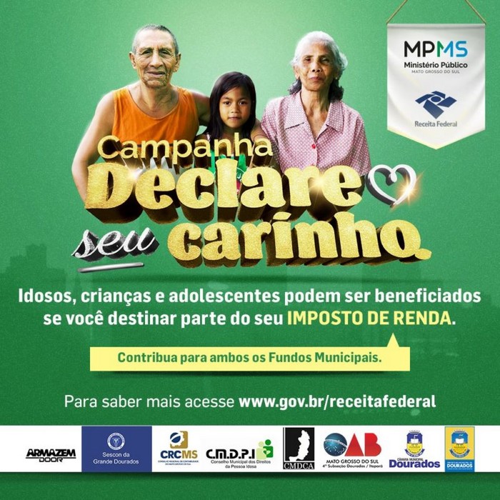 Neste sábado (7), a partir das 10h, na Praça Antônio João, o MPMS (Ministério Público do Estado de Mato Grosso do Sul) por meio das Promotorias de Justiça da comarca de Dourados, com apoio da Prefeitura de Dourados, e os parceiros, farão o Dia D da campanha Declare seu Carinho. O objetivo é conscientizar contribuintes (físicos e jurídicos) para a destinação do Imposto de Renda em prol de entidades sociais do município.