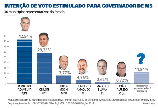 O juiz federal aposentado Odilon de Oliveira (PDT) aparece em segundo lugar com 29,35% na corrida à Governadoria, seguido pelo deputado estadual Júnior Mochi (MDB) com 7,77%, Humberto Amaducci (PT) com 4,76%, Marcelo Bluma (PV) com 2,62% e João Alfredo (PSOL) com 0,72%. Votos brancos, nulos, nenhum dos candidatos, indecisos ou não responderam totalizam 11,84%.