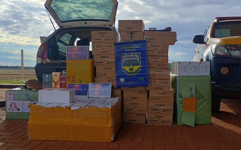 Durante a vistoria, os policiais constataram que o veículo estava carregado com diversas mercadorias de origem estrangeira sem comprovação aduaneira, configurando o crime de descaminho. Entre os produtos apreendidos estavam 25 caixas de chicletes Trident, 17 aparelhos receptores de TV marca H8, 5 tablets Xiaomi Redmi Pad 2, 4 volumes de óculos e 1 volume de perfumes de marcas variadas.