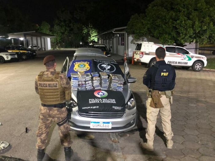 A Polícia Rodoviária Federal se Santa Catarina prendeu na noite desta terça-feira um policial penal de Mato Grosso do Sul com 53,84 quilos de cocaína em um veículo Ford Ka, cor prata.