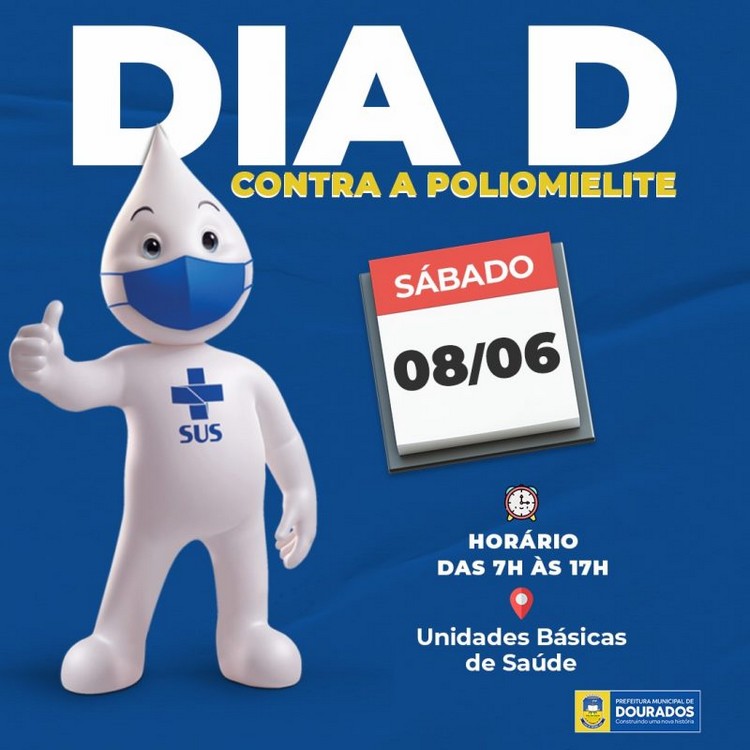 A Prefeitura de Dourados, através da Sems (Secretaria Municipal de Saúde), realiza neste sábado (8/6) o ‘Dia D’ de vacinação contra a Poliomielite, para crianças de dois meses até cinco anos de idade. A ação acontecerá das 7h às 17h, em todos os postos de saúde.