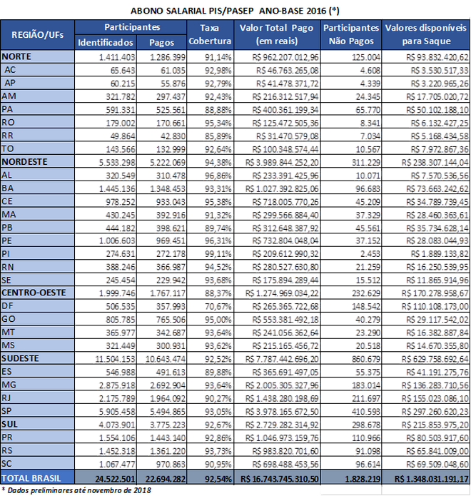 Até o momento, já foram pagos R$ 16,7 bilhões para 22,7 mil trabalhadores. A região com maior percentual de beneficiários a receber o Abono 2016 é a Centro-Oeste, onde 11,63% das pessoas com direito ao recurso ainda não foram ao banco receber.