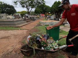 Já a estudante de Odontologia Marina Telol Matos Nantes, 43, estava com familiares e amigas para, em mutirão, limpar o túmulo do pai, falecido há 15 anos. “A gente veio dar uma limpada, tirar um pouco da grama, da poeira, do barro, plantar flor”, falou. Ela depositou flores artificiais no túmulo e revelou que ainda vai voltar, com flores naturais, no domingo. “Nós sempre participamos da missa. A ideia é vir, mesmo com chuva. Só se estiver chovendo muito forte, aí a gente não vem”, ressaltou. “É um momento importante, reunir a família, matar a saudade um pouquinho e rezar também”, completou.