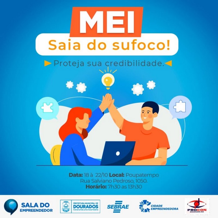 A Prefeitura de Dourados, por meio da Secretaria Municipal de Desenvolvimento Econômico, em parceria com o Procon, Sala do Empreendedor e Poupatempo, realiza a campanha “MEI – Saia do Sufoco! – Proteja sua credibilidade”.