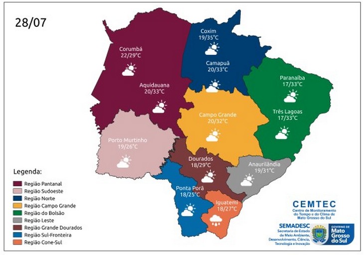 No Pantanal, mínima de 22°C em Corumbá e máxima de 29°C; Aquidauana terá variação entre 20°C e 33°C. Na região sudoeste, Porto Murtinho amanhece com 19°C e chega aos 26°C ao longo do dia. No norte, em Coxim espera-se a máxima mais alta do Estado podendo atingir os 35°C. No Bolsão, Três Lagoas terá 17°C pela manhã e 33°C de tarde.