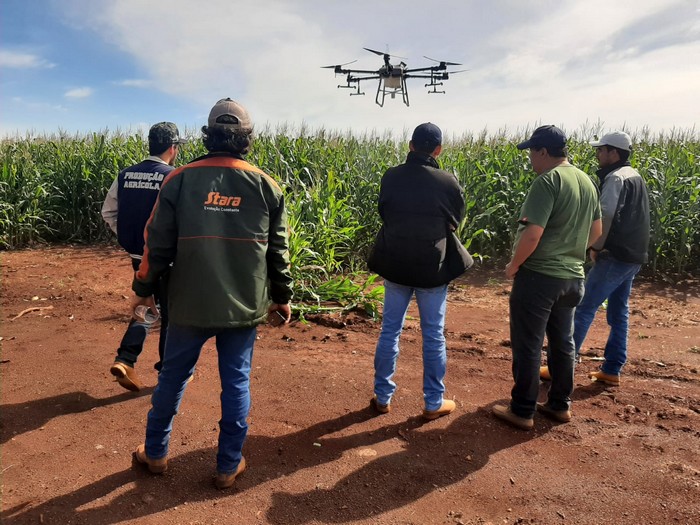Representantes da 3D Agrotech Engenharia e Agrotecnologia estiveram na Fazenda Olho D’Água, zona rural de Dourados, para demonstrar o funcionamento do drone DJI Agras T-30, uma das novidades no segmento. O aparelho é produzido na China, importado pela empresa sediada em São José dos Pinhais-PR e com certificado na Anatel. Esse modelo levanta voo com até 30 litros de defensivo ou 40 kg de sementes. A bateria tem autonomia de aproximadamente 25 minutos e a carga total é feita em até 12 minutos.