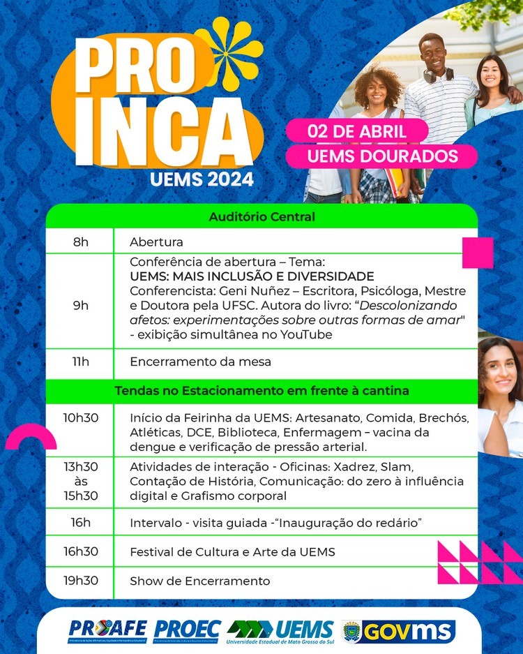 De acordo com o pró-reitor da PROAFE, prof. Dr. Diógenes Cariaga, “para este ano a sugestão é que trabalhemos a construção de uma universidade mais inclusiva e plural sob o título de UEMS: mais inclusão e diversidade que se expresse em uma programação mais plural dividida em palestra, oficinas, minicursos, rodas de conversas, performances artísticas e culturais promovidas por coletivos estudantis, docentes, grupos e centros de pesquisa no período de realização do PROINCA”.