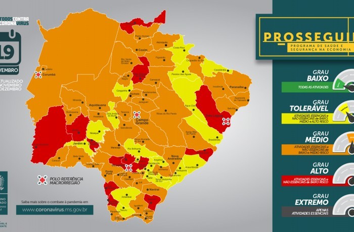 De acordo com a atualização de dados, os municípios de Caracol, Figueirão, Jaraguari, Juti e Selvíria passaram da bandeira amarela (de risco tolerável) para bandeira laranja (de grau médio de risco). Já os municípios de Aral Moreira, Bataguassu, Coronel Sapucaia, Guia Lopes da Laguna, Itaporã, São Gabriel do Oeste, Sonora e Três Lagoas estão agora na bandeira vermelha (com alto grau de risco).
