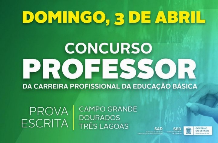 Secretaria de Estado de Educação (SED) e Secretaria de Estado de Administração e Desburocratização (SAD), realizam neste domingo (03.04), no período vespertino, nos municípios de Campo Grande, Dourados e Três Lagoas, a prova escrita objetiva do Concurso Público de Provas e Títulos, para 722 vagas, no cargo de professor de carreira profissional da Educação Básica do quadro de pessoal da Secretaria de Estado de Educação.