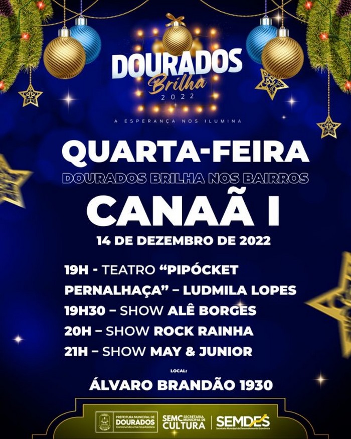 O “Dourados Brilha 2022” encerra a passagem pelos bairros e distritos do município, nesta quarta-feira (14), visitando a região do Canaã I. O evento começa às 19h e acontece na rua Álvaro Brandão, 1930. Vale lembrar que a festa de fim de ano do município continua até o dia 20 de dezembro com agenda na Praça Antônio João.
